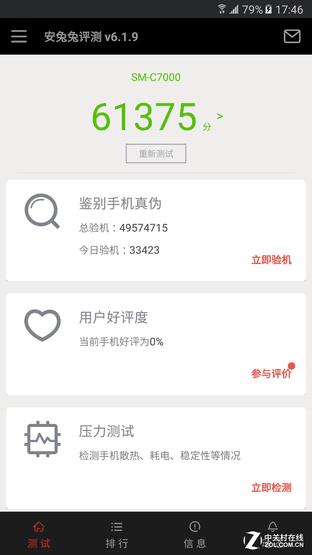 光说不练假把式,要想了解这颗处理器的性能,还需要从实际操作来看。本次使用的机型是三星不久前上市的C7,该机型配置为骁龙625+4GB的组合,测试通过软件测试、游戏体验两个方面入手,来看骁龙625的表现到底如何。