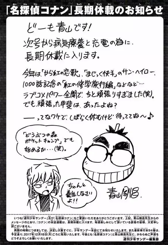 近日这本国民漫画的作者青山刚昌在网上宣布长期休刊的消息。他说因为自己身体的原因,需要疗养和充电,漫画回归时间不确定。