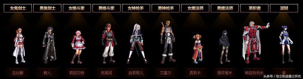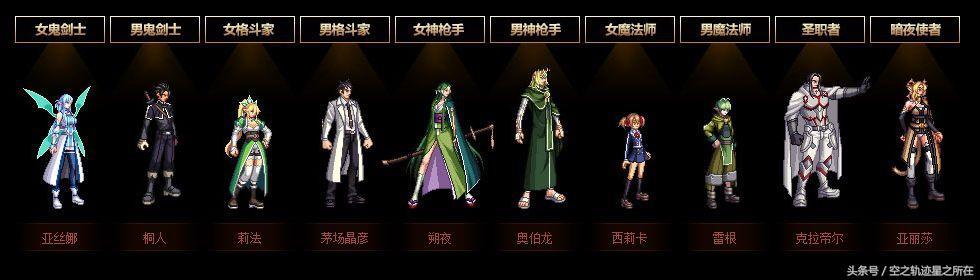 职业:鬼剑士(男,女),格斗家(男,女),神枪手(男,女),魔法师(男,女),圣职者,暗夜使者
