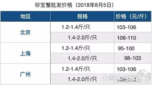 昨晚(8月5日晚),北京和广州地区的鲜活珍宝蟹市场报价纷纷达到110元/斤左右,在部分二线地区还有超过110元/斤的价格,持续涨价一个多月的珍宝蟹价格来到新的高度。有进口商戏言:珍宝蟹价格比波士顿龙虾都还要贵了!说不定明天还不止110元/斤了。”