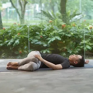 仰卧,双膝弯曲。在将双膝向左降低之前,将臀部稍微向右移动。当你的脊椎扭转时,将你的右肩胛骨放在垫子上。将右臂放在靠近头部的地上,肘部弯曲成直角。记得在另一边重复这个姿势。