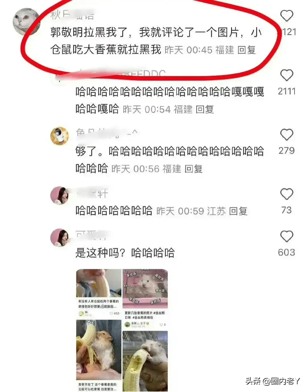 有看热闹不嫌事大的网友,去郭敬明微博评论区里,留下了仓鼠吃香蕉的图片,结果被郭敬明秒删、拉黑处理,也是有些搞笑了,小四这是汗流浃背了吗?