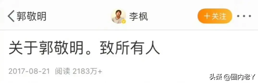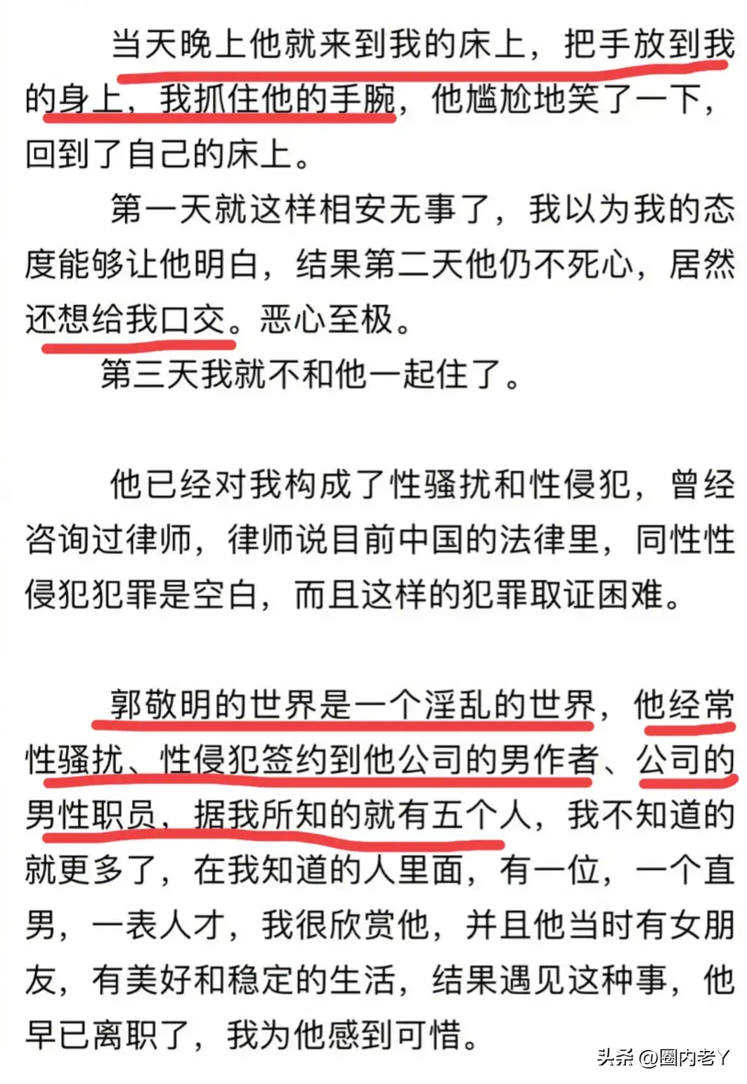 早在 2017 年的时候,李枫就曝光过被郭敬明“性骚扰”一事,奈何手里没有实质性的证据。同时曝出,郭敬明是一个非常荒淫、淫乱的人,同公司的五位男作者都被性骚扰过