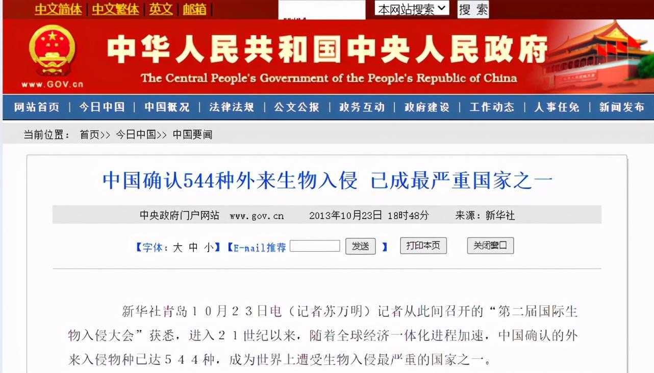 目前入侵中国的外来生物已经确认有544种,其中大面积发生、危害严重的达100多种。我国防范外来生物入侵的形势严峻。