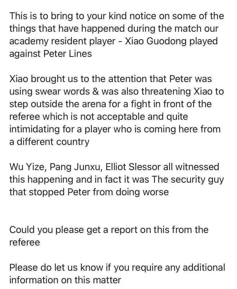 投诉信显示,莱恩斯在裁判在场的情况下,对肖国栋骂脏话,并且还威胁让肖国栋到体育场外去打架。而最终,是保安制止了莱恩斯做出更恶劣的行动。另外两位球手庞俊旭,斯莱塞都目睹了这一幕。