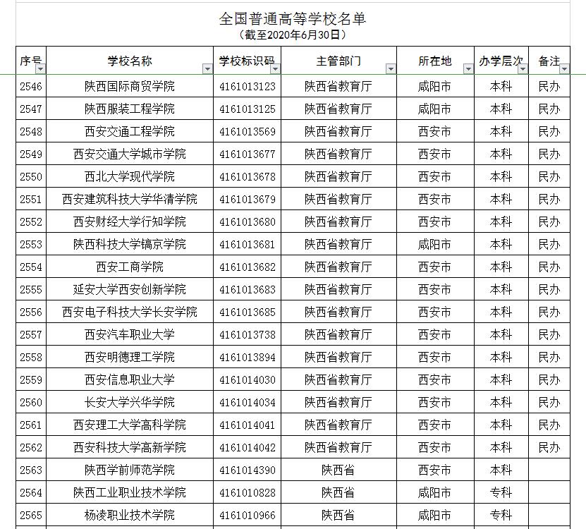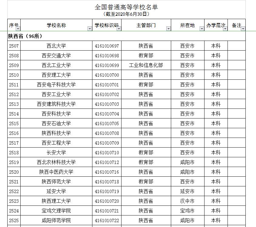 至2020年6月30日,教育部公布的2740所全国普通高等学校中,陕西省有96所:
