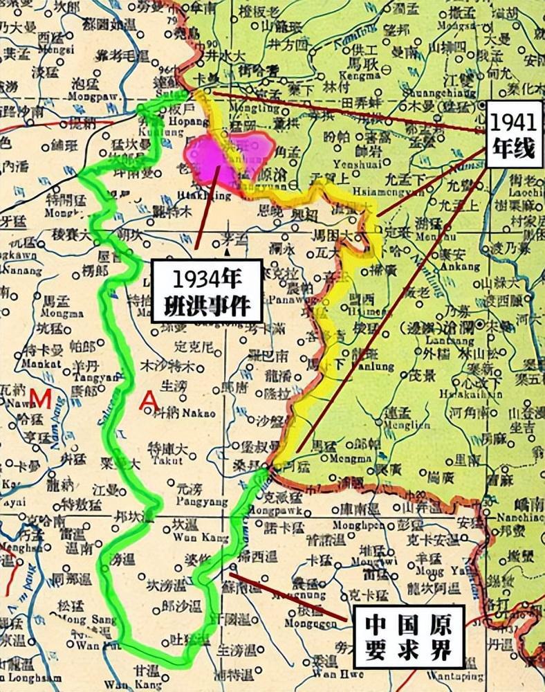 南段(尖高山以南)基本保持了1841年线以来的走向,中国放弃了对南坎名义上的主权(永租,年租金1000卢比,与完全割让没有任何实质区别),但对于1941年线阿佤地区边界线作相应修改,原被划给了缅甸的班老、班洪地区重新归属中国。
