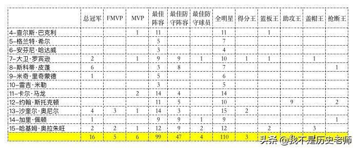 上图可以看到,梦三队全体一共拥有16枚戒指,5个FMVP,6个常规赛MVP,99次最佳阵容(含一、二、三阵),47次最佳防守阵容(含一、二、三阵),4次最佳防守球员,110次全明星,3次得分王,4次篮板王,9次助攻王,4次盖帽王,4次抢断王。
