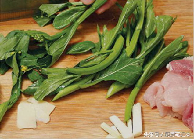 然后我们将菜心洗净,猪里脊切片,葱洗净切断,姜洗净切片备用。