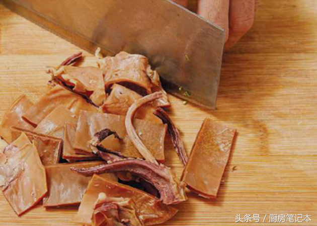 首先我们把鱿鱼干用水泡发30小时,(基本前一天就要开始准备了),然后切厚片。