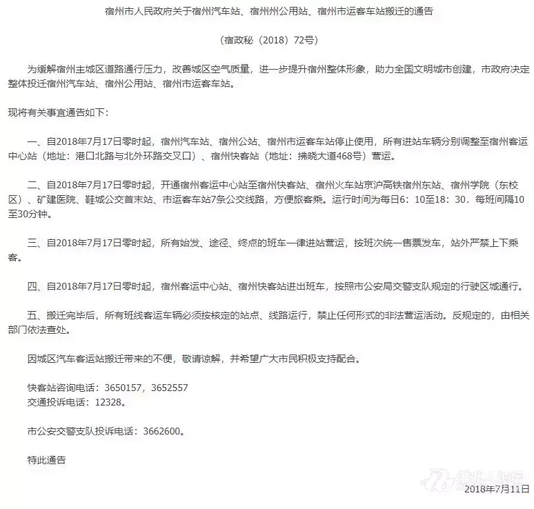 为缓解宿州主城区道路通行压力,改善城区空气质量,进一步提升宿州整体形象,助力全国文明城市创建,宿州市政府决定整体搬迁宿州汽车站、宿州公用站、宿州市运客车站。