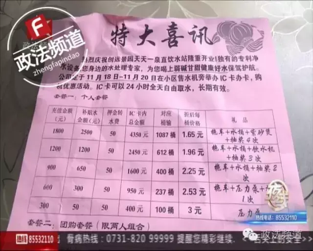天天一泉工作人员声称自家的水含有矿物质,是可以直接饮用的水。随后,销售员拿出一张宣传单,上面标明着天天一泉水的价格。