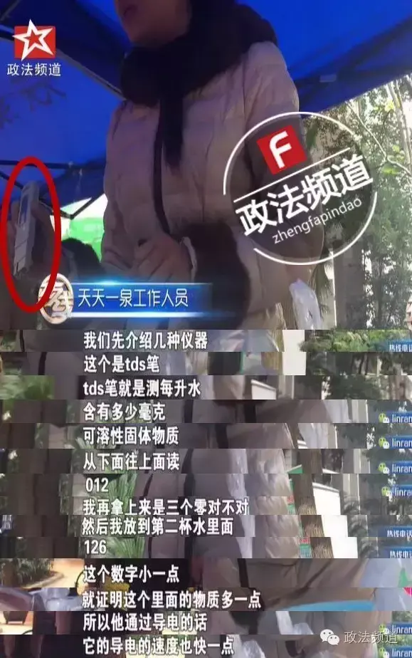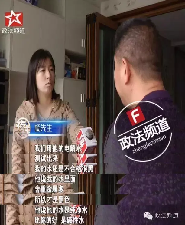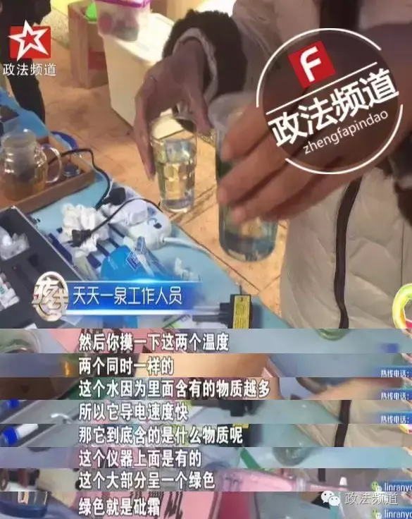 这位销售员将两种水分别倒入两个塑料杯中,并进行了所谓的电解质检测。