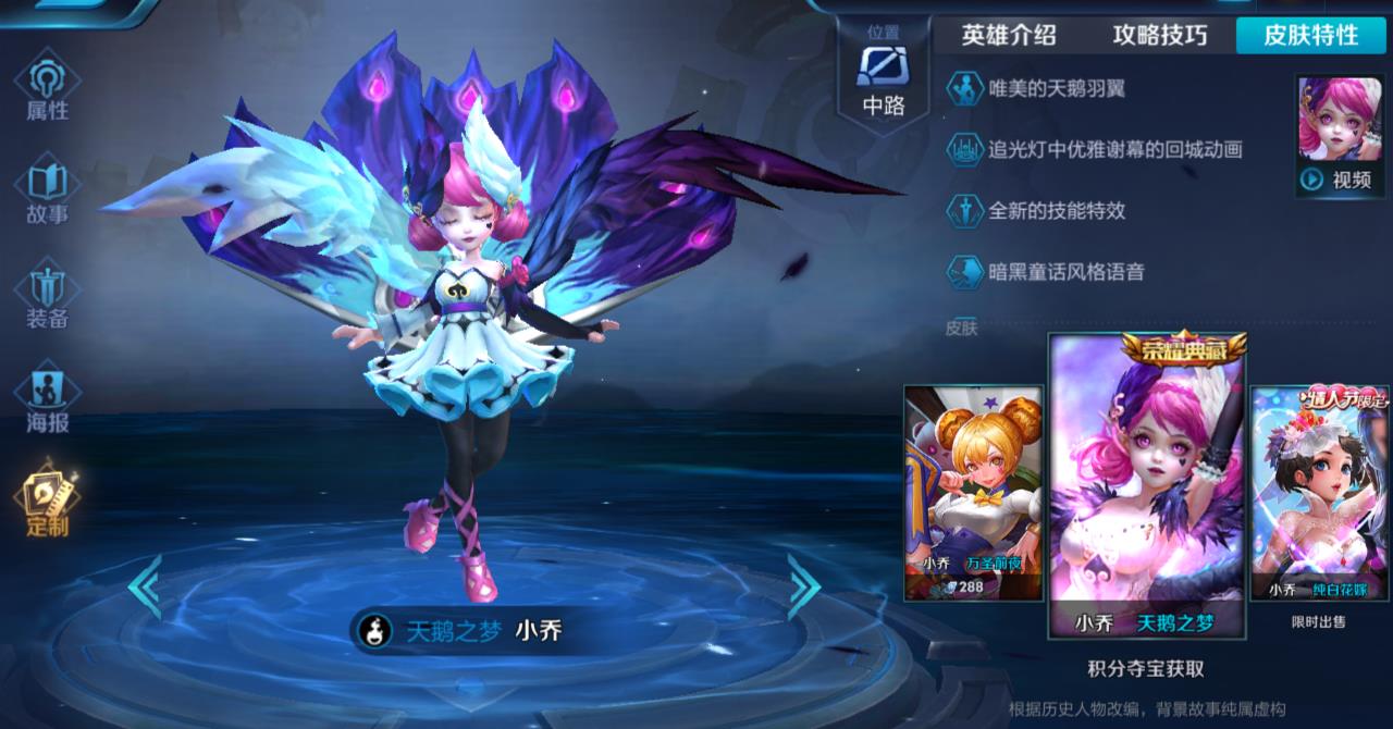 然后就是小乔的这一款天鹅之梦皮肤了,这一款皮肤算是王者荣耀里面皮肤品质最顶级的一个标准了,而且它是小乔众多皮肤里面最贵的一款皮肤,我们都知道它是一款荣耀典藏的皮肤,需要大家去积分夺宝里面将自己的夺宝值达到最大,然后获得一个荣耀水晶才可以兑换这款皮肤,所以说这款皮肤还是非常昂贵的,拥有的玩家基本都是土豪玩家了。不过这款皮肤无论是从皮肤品质还是技能释放,手感来说都是非常不错的,大家如果是有荣耀水晶的话,还是可以去兑换这款皮肤的。