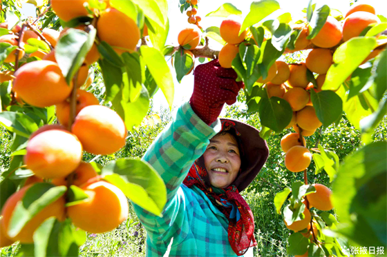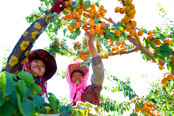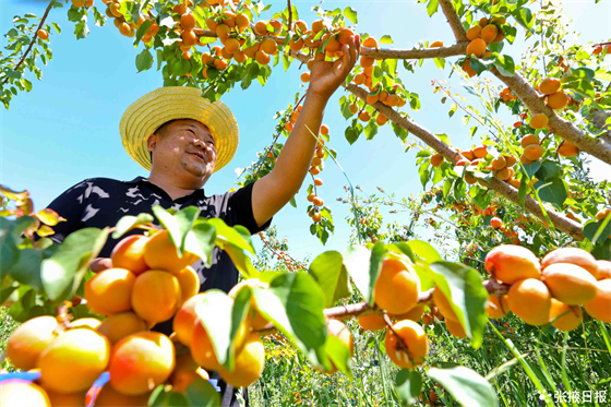 2022年6月22日,甘肃省张掖市临泽县万亩珍珠油杏、大黄杏、杏王、水晶杏等种植基地的各种优质鲜食杏进入成熟采摘期,杏园内到处是种植农户们采摘、精选和运往市场销售忙碌的景象,众多游客也纷至沓来观赏丰收美景和采摘诱人的果实。(记者 王将 摄)