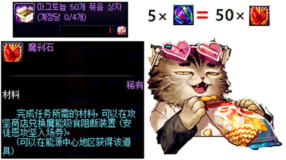 1个新材料可以兑换50个魔刹石,按韩服时空石价格计算1个魔刹石1000金币,按国服时空石价格计算1个魔刹石830金币。然而国服并没有这一功能,现在拍卖行中魔刹石的价格大概在2000金币左右一个。