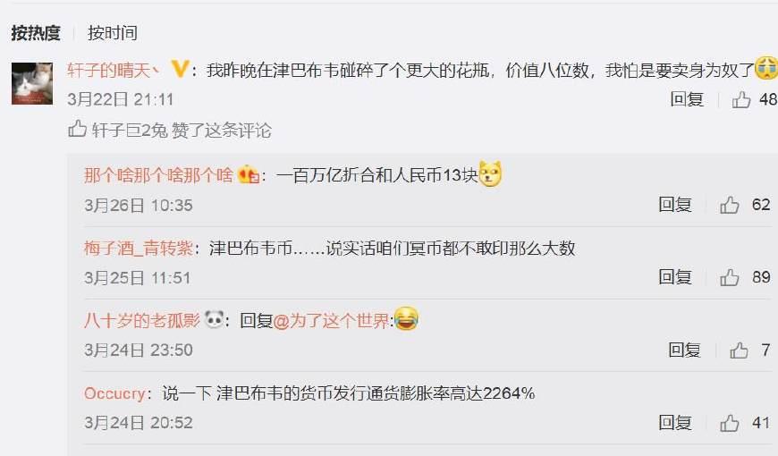 事情发生后,有网友表示自己也有同样的遭遇:“ 我昨晚在津巴布韦碰碎了个更大的花瓶,价值八位数,我怕是要卖身为奴了。” 八…八位数,正当小编错愕之际… 突然看见聪明机智的网友表示,津巴布韦通货膨胀啊!那里的一百亿也就相当于咱们人民币的13快… 小编想说 大兄弟你是猴子请来搞笑的吗?