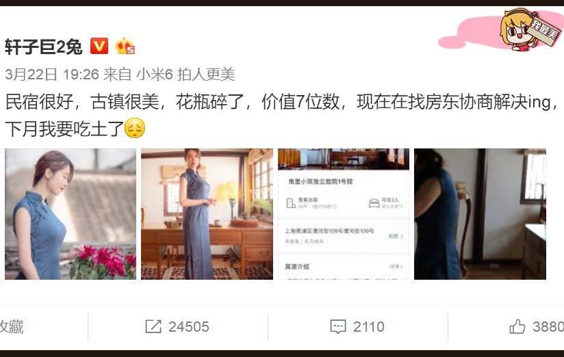 前段时间,轩子姐姐发表了一条内容为:“ 民宿很好,古镇很美,花瓶碎了,价值7位数,现在在找房东协商解决ing,不然下月我要吃土了”的微博,图片内容则是轩子姐姐工作时的美照和民宿的图片。等等,这是什么?微博P4则是风格不同于前两张的模糊照片。