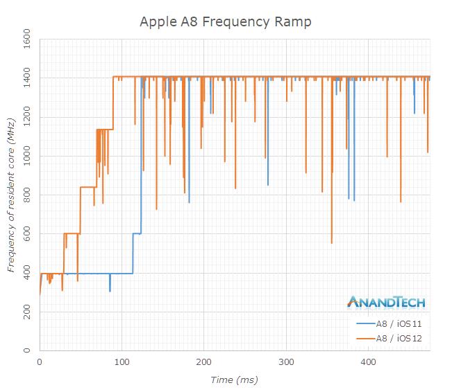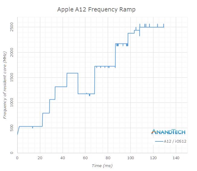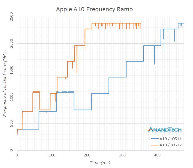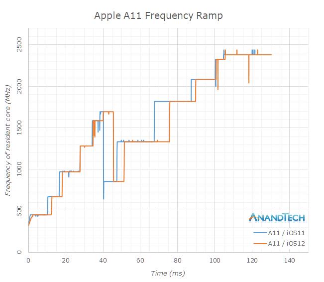 一家名为 anandtech 的媒体分别对运行 iOS11、iOS12 的 iPhone6、6s、7、X、Xs 进行了测试,测试以上手机的 CPU 从闲置状态飙升到峰值所用的时间。