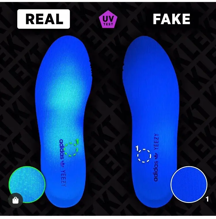 最后,杀手锏了,看UV灯照射下的鞋垫。在UV灯的照射下,真的椰子呈现出浅色的图案,有一颗一颗的白点,而假的椰子没有任何反应,整个鞋垫都是蓝色,光秃秃。
