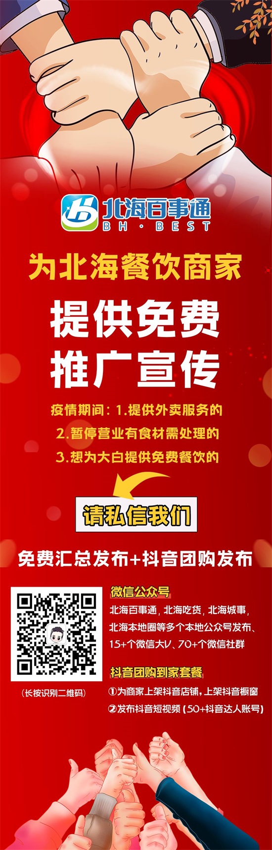 疫情期间,北海很多餐饮美食商家不营业,原本买好的食材无法及时得到处理,目前收到了50多家商家的求助,北海百事通通过线上宣传及时协助解决他们的困难。