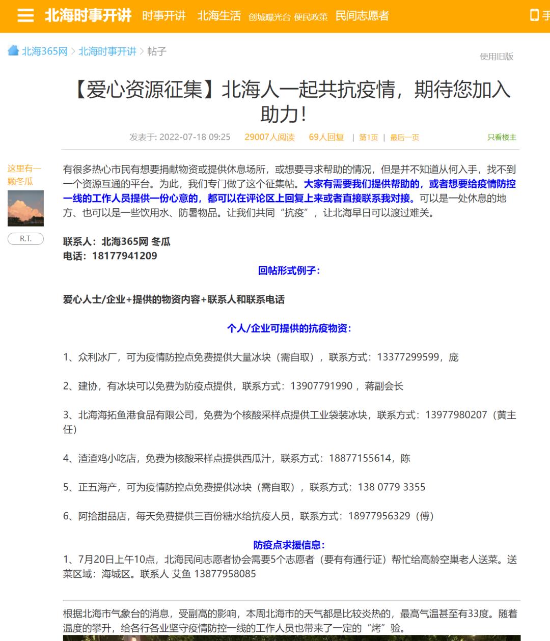 有很多热心市民有想要捐献物资或提供休息场所,或想要寻求帮助的情况,但是并不知道从何入手,找不到一个资源互通的平台。7月18日,北海365网在论坛发起“【爱心资源征集】北海人一起共抗疫情,期待您加入助力”征集倡议。将北海的冰块、餐饮等爱心物资资源,以及社会各界求助信息,进行资源整合。
