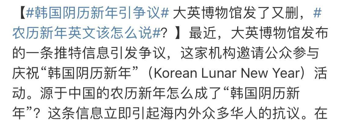 春节是全球海内外华人华侨最重要的节日。最近几年,一些国家采用“Lunar New Year”庆祝春节,比如韩国就称其“Korean Lunar New Year ”。昨天上热搜的英国大英博物馆因为写的是“韩国阴历新年”被骂,许多网友认为是在故意混淆文化,所以我们要坚持强调“Chinese New Year”。