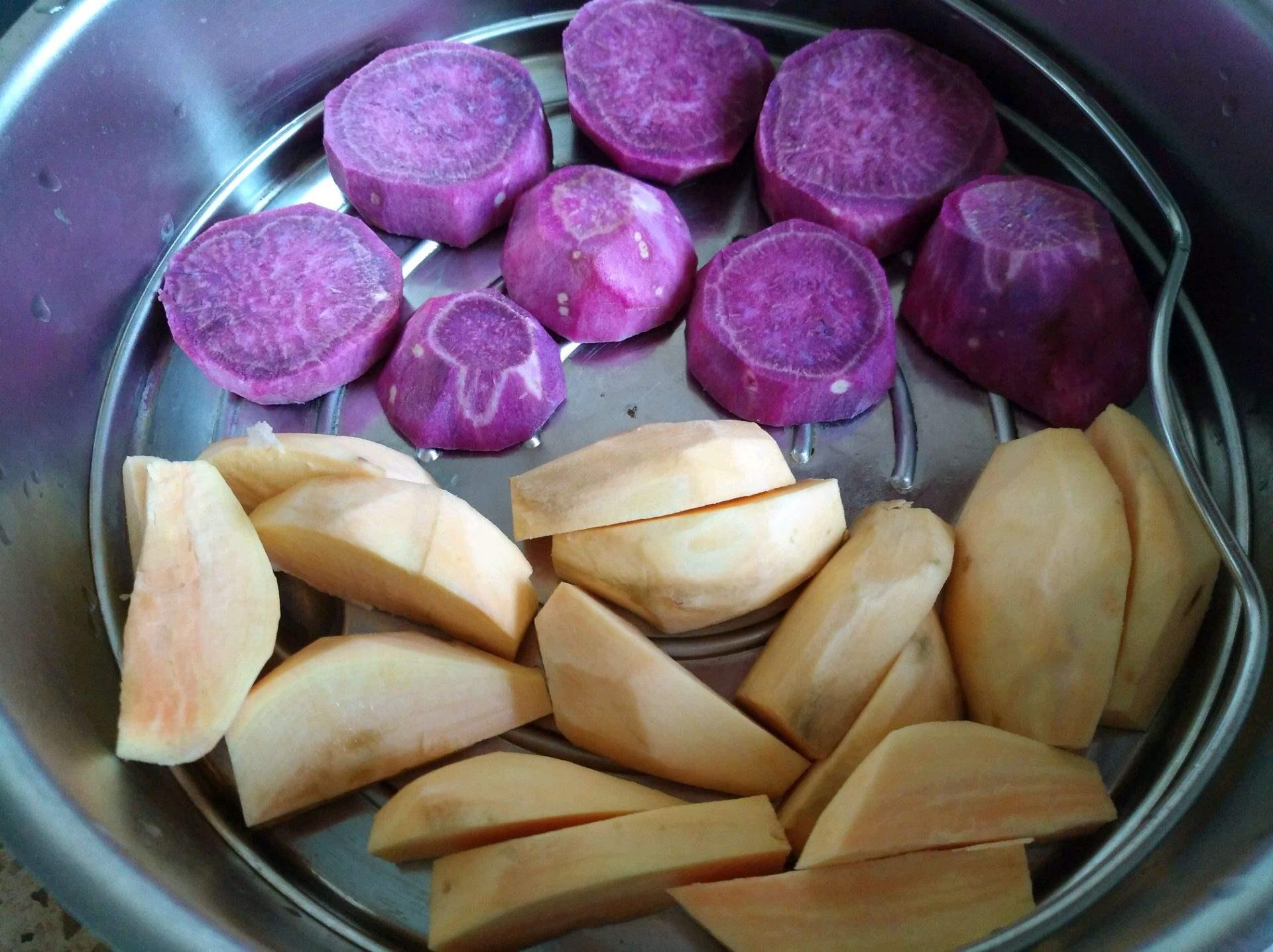 第一步:准备好南瓜、紫薯以及红薯,将其清洗干净,削皮,切成小块,分别加入到木薯粉中,加入适量的水以及白糖,搅拌成絮状,再揉成面团,将其分成若干部分,搓成长条,将其切成大小均匀的小坨,起锅烧水,水开后将其放入锅中,等到浮起来之后,将其舀出,立马放入冷水中冷却。
