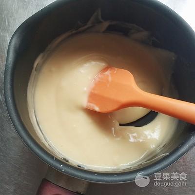 14、一边小火加热,一边搅拌,使豆乳卡士达奶油浓稠且富有光泽。盛出后,冷却待用。
