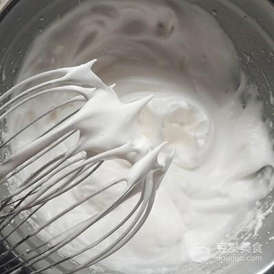 6、将细砂糖分三次加入蛋白中,用电动打蛋器打发成干性发泡。