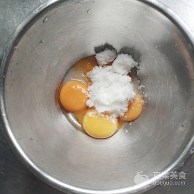 11、再来做豆乳。蛋黄中加入细砂糖搅打到糖溶化。