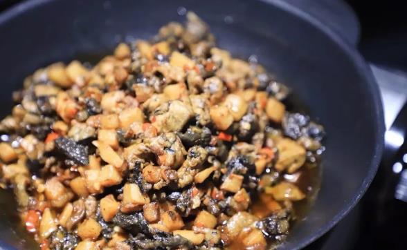 配上家常土豆和木耳用铁锅,先炒后焖,锅气很重且口感不凡。