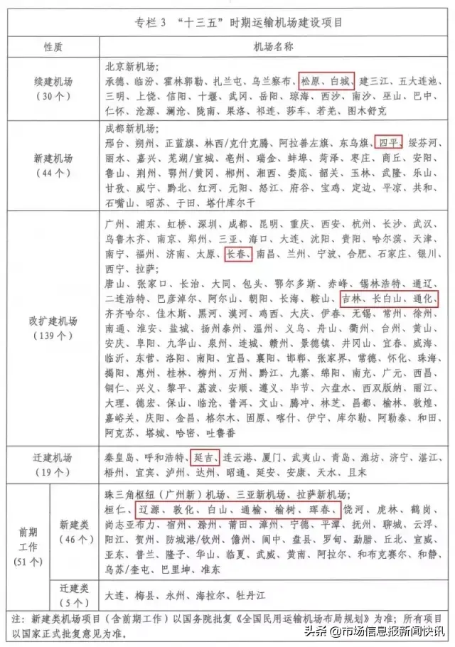 改扩建的139个机场中——长春、吉林、长白山、通化均榜上有名;