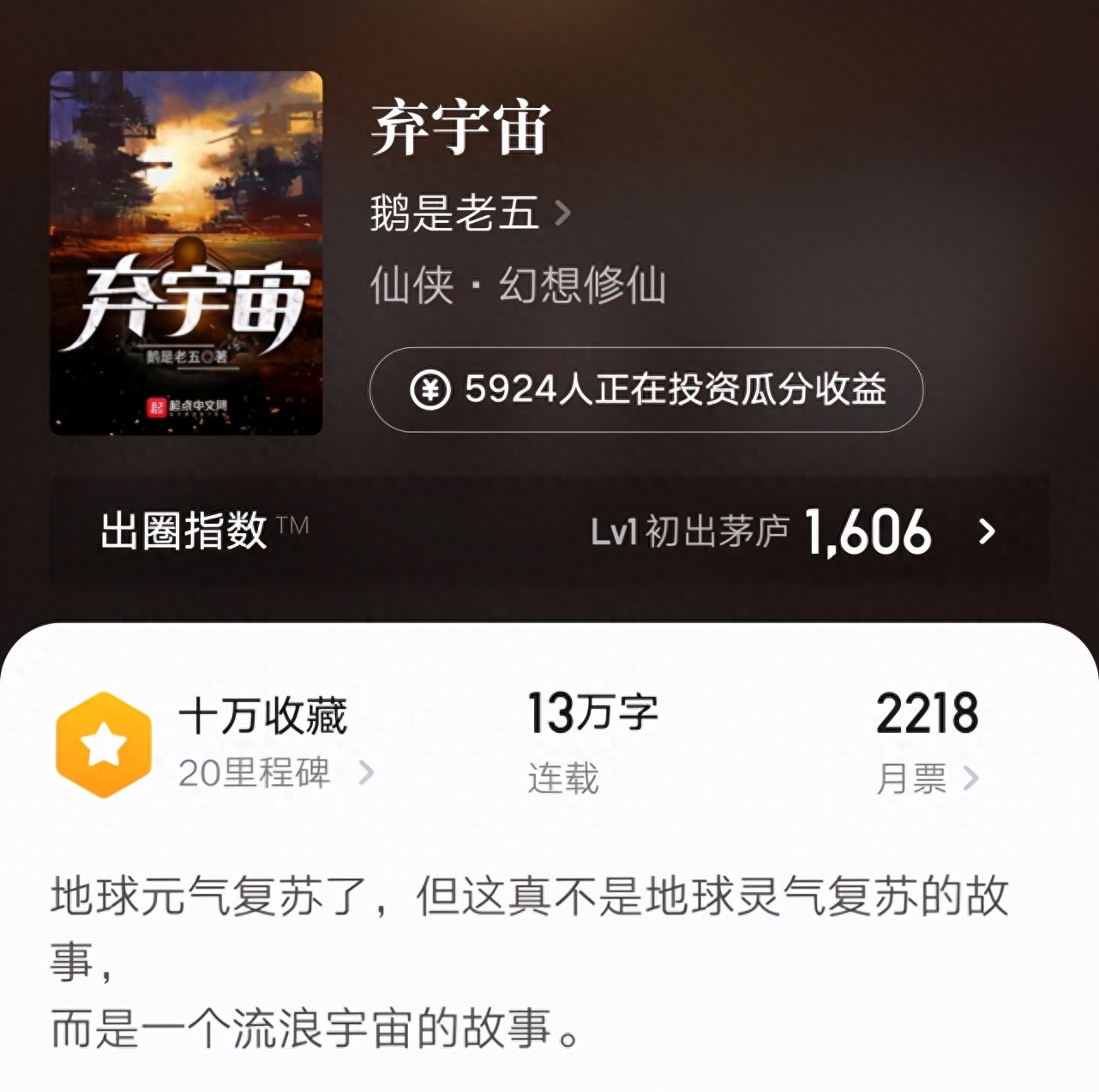 这本新书也是在上月上线的,风格上依旧走宇宙修仙的风格。