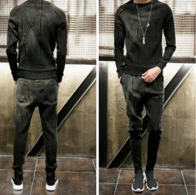 假两件的上衣给人很学院风的感觉,因为领子的关系,有点像衬衫的赶脚,但整体又给人很休闲的范儿。搭配上休闲的小脚裤是绝配了,整体看起来非常时尚有着男神气质。相信在秋季男士这样穿搭出行会迷倒不少少女哦~