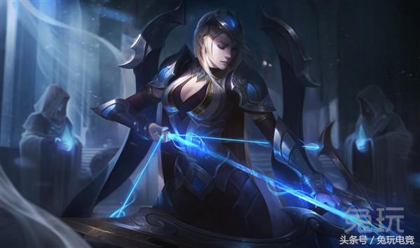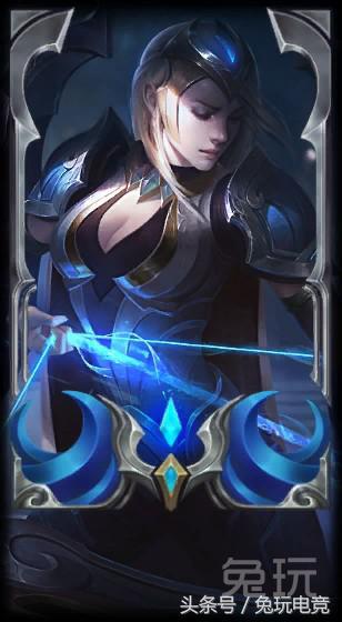 艾希在宫殿内身穿蓝色盔甲拉弓试箭,箭身水晶透明散着淡淡蓝光,十分醒目,整体风格冷峻高贵,衬得出寒冰的气息。