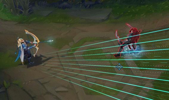 Q技能在积攒完备后,飘带会闪烁彩虹光芒,长弓也会变成金色,将箭悉数射出。