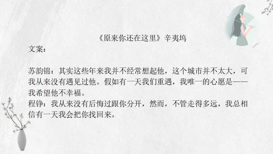 《原来你还在这里》苏韵锦与程铮,高中的互动青涩别扭,因为家庭原因两人分了手,兜兜转转相遇又在一起,男主深情。小w看的是原版小说,很多网友的对两个人各自分开的经历比较介意,小w觉得偏现实向的文,总会把一些伤疤赤裸裸的展现出来,总体文还是值得一看的。
