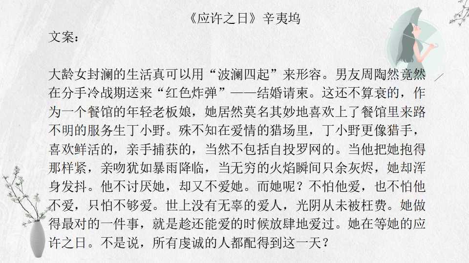 辛夷坞的文字充满青春的伤痛和现实主义,阅读后回味无穷,怅然若失。喜欢甜文和一生一世一双人的小伙伴慎入!