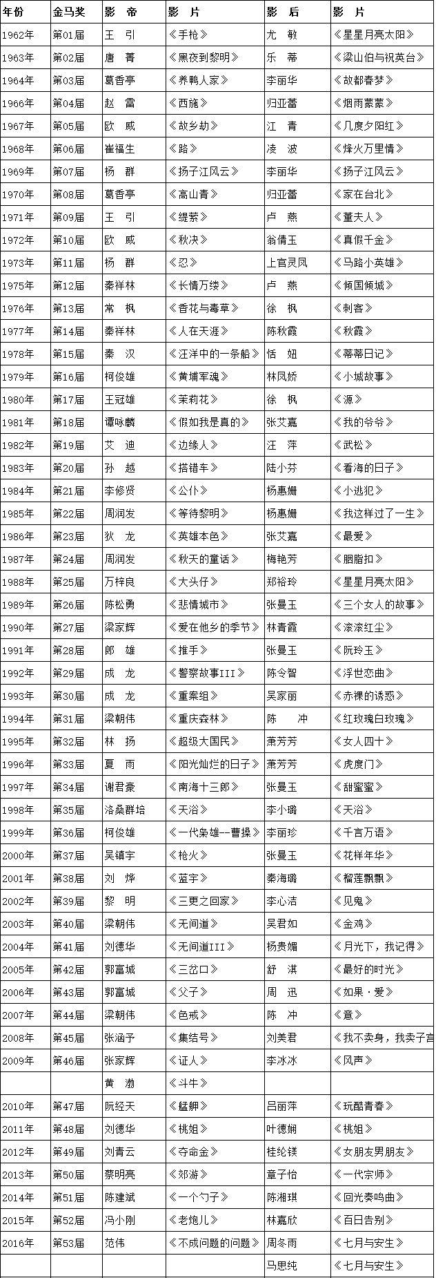 当然,金马奖获得影帝最多的人是凭借《重庆森林》《无间道》《色戒》三次获奖的梁朝伟,获得影后最多的人是凭借《三个女人的故事》《阮玲玉》《甜蜜蜜》《花样年华》四次获奖的张曼玉。下面为完整名单: