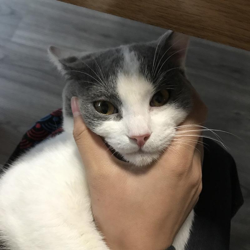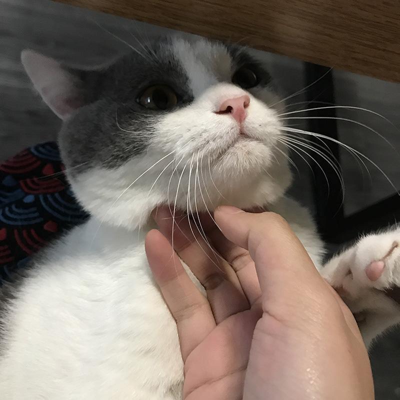 然后两只手抓住猫的脸颊两侧,做一个提神动作,就是尽量让它像在微笑一样。这样子可以让猫咪不那么紧张,毕竟太紧张的话,小编觉得可能口感会比较苦涩,所以做个脸部按摩,让它笑一笑,就不会那么苦了。虽然它看上去笑得不是很灿烂,但是应该也没什么关系。