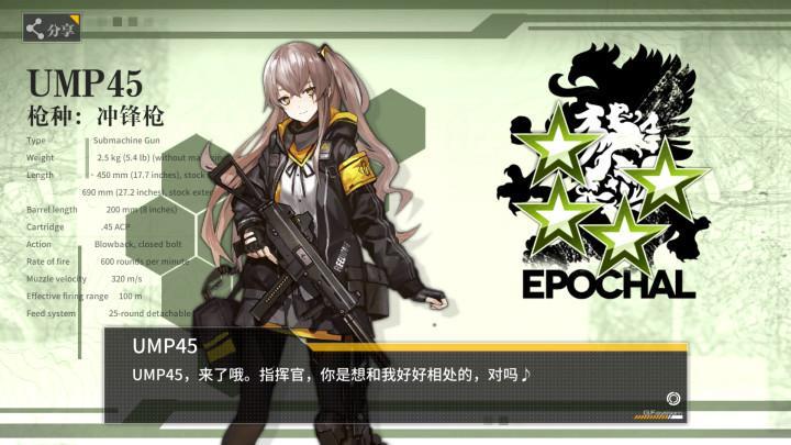 大家就可以认真的看一看获得枪娘时的背景板,做一个小小的对比:冲锋枪UMP45和散弹枪艾尔菲尔特。其中,UMP45美国特种部队使用的冲锋枪,所有的相关数据都有资料可以在其百科中获得具体数值,这里大家可以参考一下获取的背景板和数据的对比。