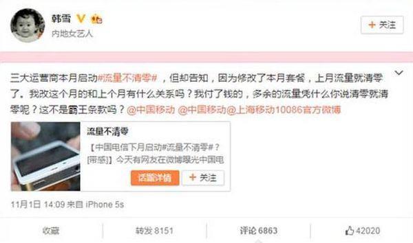 韩雪发了一条微博,抱怨中国移动的"霸王条款"。她很生气的说"三大运营商本月启动流量不清零活动,但却告知,因为修改了本月套餐,上月流量都清零了。我改这个月的和上个月的有什么关系吗!我付了钱的,多余的流量你凭什么说清零就清零?这不是霸王条款吗?"