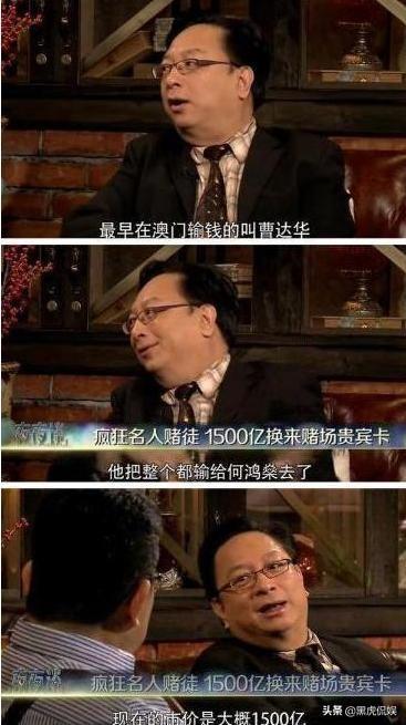 同时,也成为澳门最早的赌徒,主持人杨锦麟和嘉宾谭志强说他输掉了约合现在1500亿的房产、还有大部分的物业,当时的3亿到现市值1500亿。