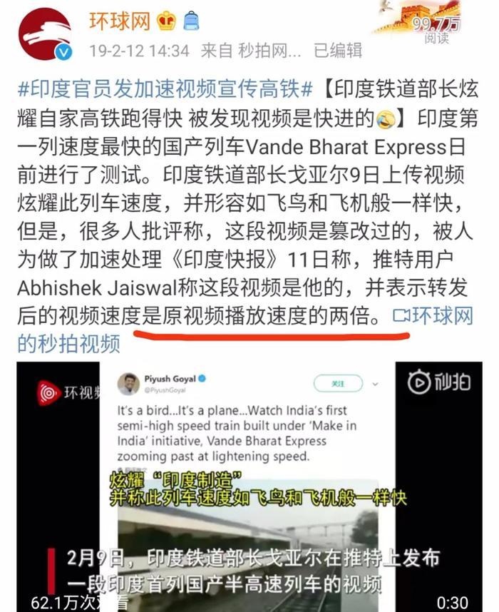 去年某印度官员不还为了吹嘘自己国家的高铁速度,制作了 2 倍速的火车行驶视频吗。