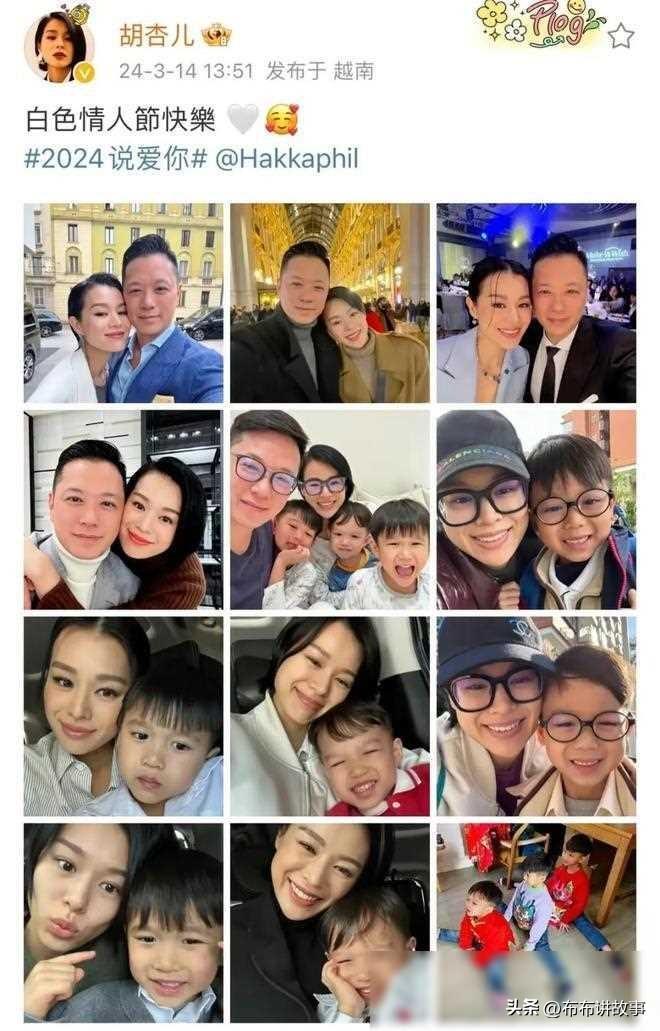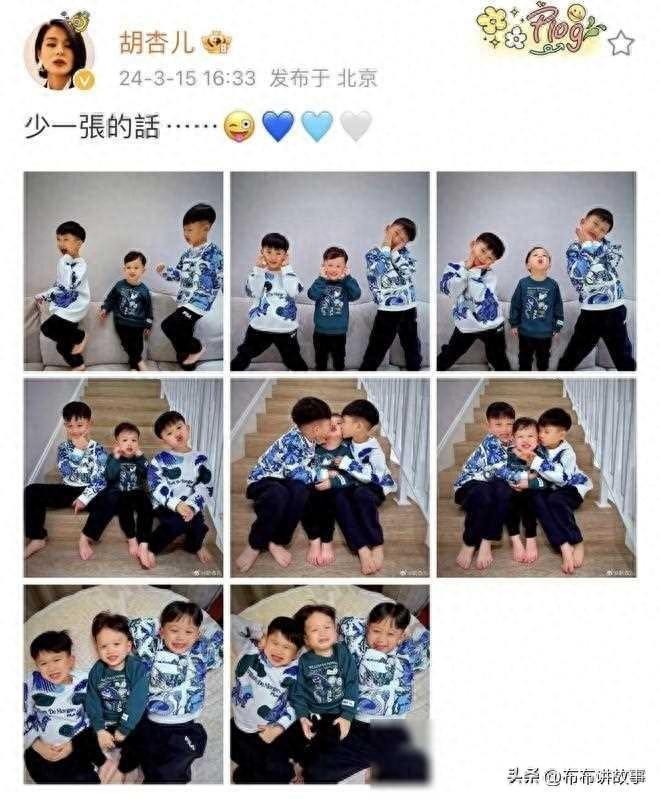 胡杏儿在社交媒体上分享了一组她与三个儿子的照片,展现了兄弟三人之间的亲密互动。照片中,6岁的大儿子奕霆和3岁的二儿子奕霖穿着相似的兄弟装,而2岁的小儿子奕宏则穿着蓝色的卫衣,站在沙发上摆出可爱的姿势。他们还在楼梯上坐在一起合影,每个孩子都展现出独特的个性,奕霆帅气、奕霖活泼可爱、奕宏调皮顽皮。最后,两个哥哥还亲吻了弟弟,表达了深深的爱意。这样温馨的画面让人感受到家庭的温暖与幸福。同时,在白色情人节,胡杏儿还分享了一家五口的合影,展示了与丈夫李乘德的甜蜜关系以及整个家庭的幸福生活。胡杏儿与李乘德的婚姻生活充满了爱意,再加上三个可爱的儿子,构成了一个完美的家庭画面。