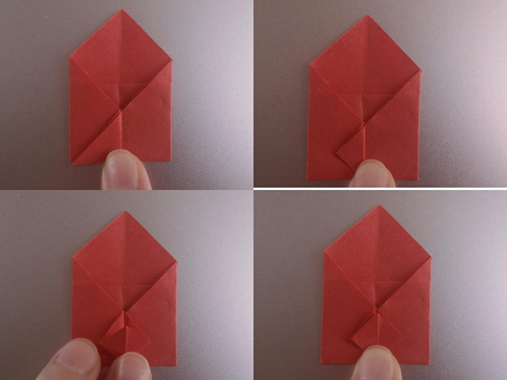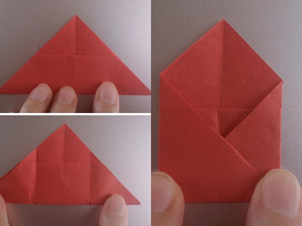 3,小角折回去,然后继续对折,压出折痕后打开,压下去。