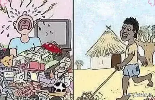 3、我们看到图片分成了两个部分,左边是一个小孩在哭他的身边有很多的玩具但是却依然是不满意的样子,再看看右边的这个孩子他的手里拿着一个很是破旧的玩具但是却洋溢着笑容。不光是孩子,其实大人也是这个样子的,满足这件事不是那么的容易的。