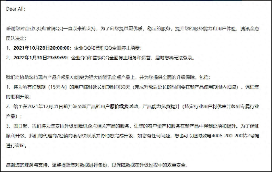 腾讯企点团队表示,2021年12月31日之前,企业QQ将升级至腾讯企点的企业主号,营销QQ升级至企点客服标准版企业主号,并享受原价续费服务,历史升级客户可一并享受该活动。