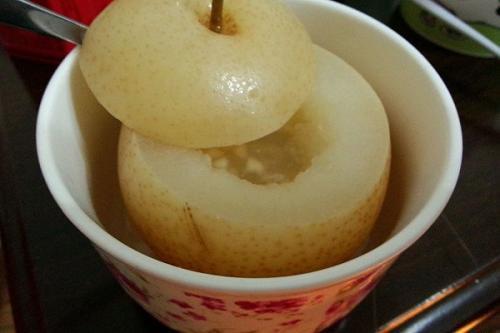 (2)选七尊川贝3-5克,放入挖空的梨内,放入适量冰糖。